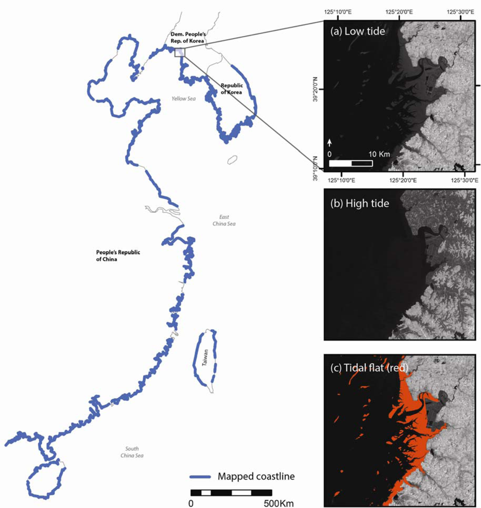 We utilized 78 Landsat TM and ETM+ images to produce the first continental scale map of tidal flats, covering 13,800 km (86.8%) of the China, Democratic People’s Republic of Korea and Republic of Korea coast (Figure 3).
