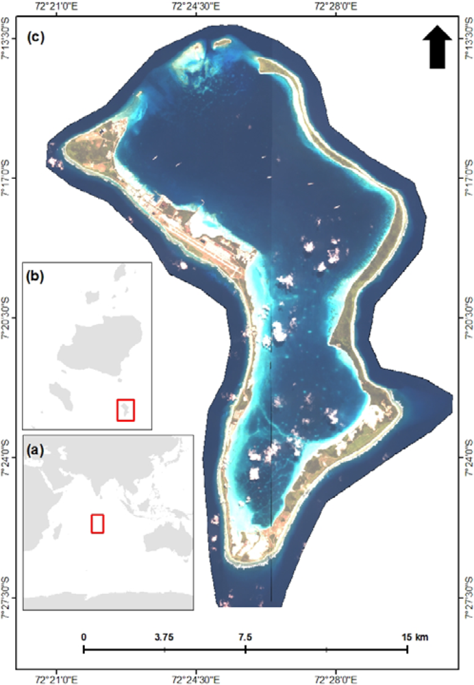 The study site (a) the location of the British Indian Ocean Territory in the central Indian Ocean, (b) the location of Diego Garcia at the southern end of the Chagos archipelago (BIOT), and (c) Diego Garcia atoll.