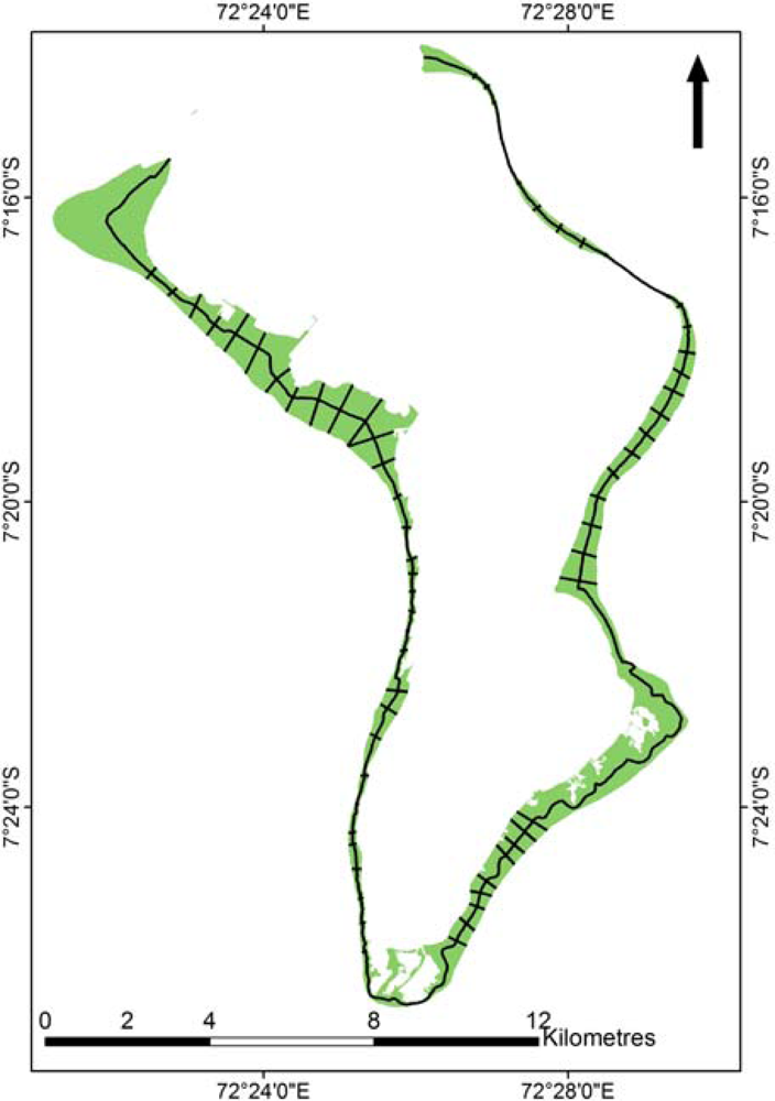 Diego Garcia is a horse-shoe shaped atoll (9 × 22 km2) that lies 55 km south of the Great Chagos Bank and represents over half the land area of the 55 archipelago islands. Approximately 70% of the atoll area is comprised of the extensive lagoon (11 km2), which is enclosed by one of the most continuous land rims of all coral atolls [13]. Isolated dunes rise to 9 m above sea level, although more commonly they reach around 5 m height on shores that are exposed to southwesterly winds [12]. Spring tidal ranges reach approximately 1.6 m and the carbonate limestone land rim has a freshwater lens that is sustained by the highest levels of rainfall in the Indian Ocean [12]. This has enabled the land rim, which is approximately 57 km in length and over 2 km wide in places, to support a well-developed vegetation community. Coconut plantations dominated the island vegetation community while the atoll was under English and French colonial control between 1876 and 1971. These were extensively cleared along the western atoll rim and several invasive species were added during construction of the airbase, beginning in 1971. Native vegetation remains in other parts of the island and in places this has transitioned through several successional stages including coastal grasses and sedges, littoral scrubs and hedges (e.g., Scaevola taccada), a mixture of shrubs and juvenile trees, termed locally as “Cocos Bon-Dieu”, broadleaf woodland and planted coconut trees [13].