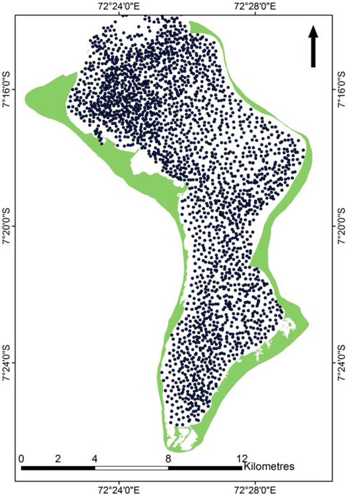 Bathymetric change within the lagoon basin was assessed using detailed sounding charts developed from hydrographic surveys in 1967 (H.M.S. Vidal) and 1998 (UK Hydrographic Office). The sounding density of the 1967 survey ranged from 100 to 200 depth records per km2, the third highest density of any atoll surveys undertaken prior to 1970, following Addu and Eniwetok [12]. The 1998 chart compiled subsequent soundings from two US government surveys of 1987 and 1988, and a further British Admiralty survey in 1997. Surveys undertaken after 1967 focused primarily in the northern sector of the lagoon adjacent to the military base, an area that has been extensively dredged. A total of 2590 numbered points from each sounding chart within the lagoon were digitized into a point file (Figure 3). These were subsequently spatially interpolated using a kriging algorithm to generate a continuous bathymetric model covering the complete lagoon area. An additional 994 points were then digitized from the subsequent hydrographic surveys to produce an updated bathymetric lagoon model and the two surfaces were then differenced to produce a bathymetric change model.