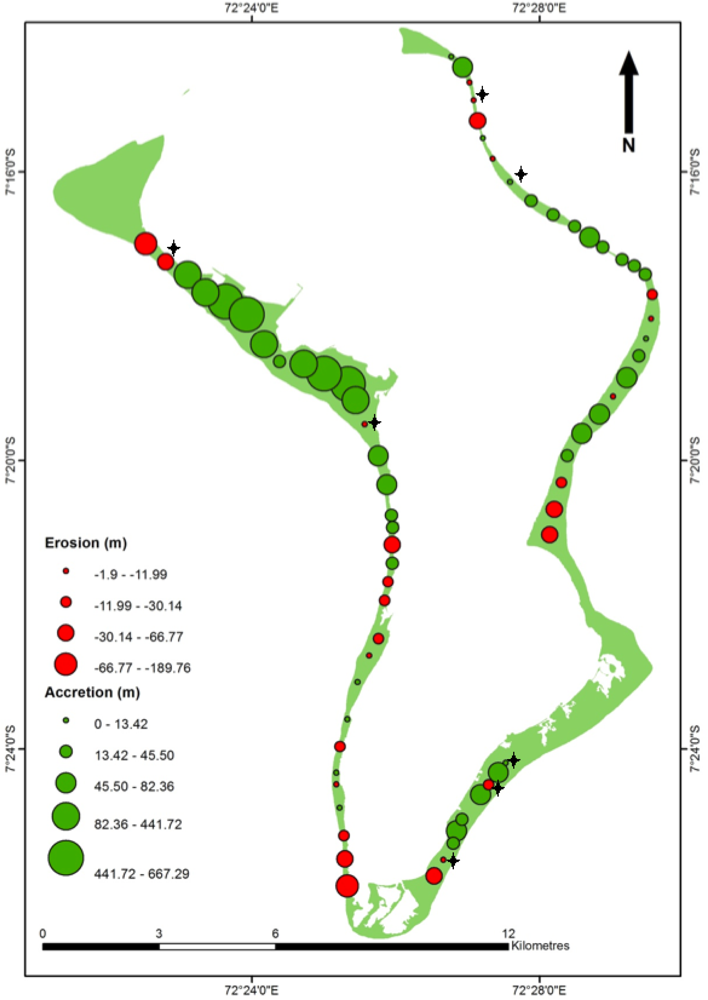 Some degree of natural variability in shoreline position around the atoll rim is to be expected as reef islands are by nature unconsolidated sedimentary landforms, the deposition of which is strongly controlled by waves [23]. This variability is apparent around the rim of Diego Garcia, with 43 points indicating net accretion and 26 points indicating net erosion across the appraisal period. It is difficult to compare these findings to shoreline change elsewhere as these vary greatly across different localities. For example, topographic and radiocarbon evidence indicates net accretion rather than erosion of oceanward atoll island shores at Cocos-Keeling, Kiribati, Funafuti and the Maldives [24], whereas reduced shoreline protection from coral mortality, has been observed to erode beaches on West Indian Ocean continental islands in the Seychelles [9].