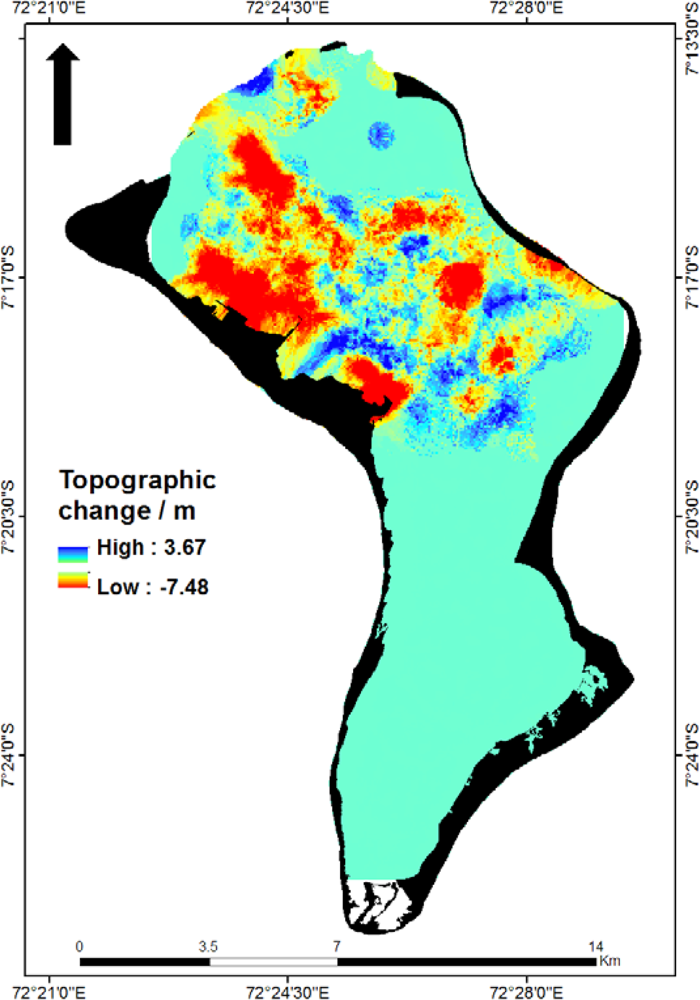 The configuration of lagoon changes indicated by the bathymetric change model results largely from developments associated with the airbase in the northwestern sector of the lagoon. These include artificial shoreline construction, the provision of a turning area for ships and an associated access channel that has been dredged to a depth of 13.6 m leading from the northern channels across to the pier [27]. Topographic highs associated with sediment addition (depicted in blue) are evident around the periphery of the sediment removal sites, possibly as a result of dumping next to excavation sites during dredging activities. The implications of these changes relate primarily to their potential impact on patterns of water circulation across the lagoon basins. It has previously been observed that water exchange between the lagoon and ocean environment is limited [12]. Widening of the lagoon channels is likely to increase the volume of water exchange into and out of the lagoon during each tidal cycle. In turn, this may influence the benthic ecology of the lagoon floor, which is known to be strongly influenced by hydrodynamics in lagoons elsewhere in the Indian Ocean [28], or result in sediment loss to the open ocean.