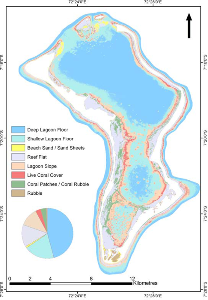 To the best of the authors’ knowledge, Figure 7 represents the first detailed record of benthic cover around Diego Garcia Atoll. Table 3 provides a description for each benthic cover type mapped. An overall accuracy of 70% was achieved when this was compared against an independent dataset of 131 ground referencing points. The classification was dominated by the deep (46%) and shallow (19%) lagoon floor classes, followed by reef flat (14%) and lagoonal slope (12%). The reef flat was characterized by coral sand and rubble at shallow water depths (<2 m), with frequent pools and Porites lutea bommie fields [21]. The lagoonal slope class comprised live coral cover of between 70 and 100%, dominated by Acropora tenuis[21].