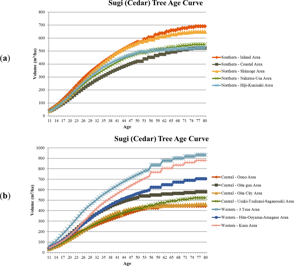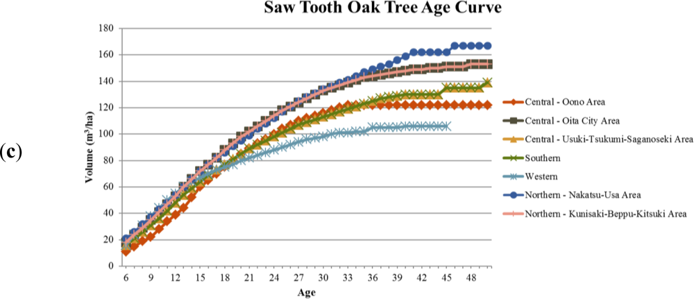 Stem volume as a function of tree ages for (a,b) the Sugi (cedar) and (c) the saw tooth oak, in Oita Prefecture. The difference of stem volume growth among the different regions in Oita is remarkable.