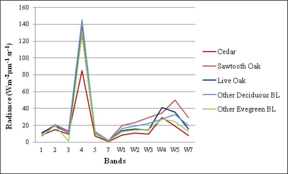 Various combinations of approaches and data sets (noncorrected vs. corrected, single vs. multitemporal) were examined in order to produce the best results for a highly accurate land cover map (Figure 7). Difficulty did arise when using single temporal datasets for producing land cover maps, especially when one has to classify the vegetation types in detail. For example, the spectral signatures (mean radiance values per training site for each band) for forested land cover types given in Figure 11 show that it is very hard to differentiate the evergreen broadleaf forests and deciduous broadleaf forests categories in the May data, because of similar signatures for most of the bands in this period of the year. However, it is shown that clear discrimination among all the different forest types can be obtained from the December data (bands W1–W5 and W7). In general, although the radiance values in December (winter season) are lower than those in May (spring season) for all the forests types, and coniferous clearly differentiated from other broadleaf forests in both seasons, it can be said that, when seasonal changes in the forests canopy are considered: (1) clear differentiation among the deciduous and evergreen subgroups of broadleaf forests can be obtained with larger radiance values for deciduous broadleaf forests than for evergreen broadleaf forests, (2) discrimination within each broadleaf forest subgroup can be obtained, with radiance values (in Wm−2·μm−1·sr−1) for saw tooth oak and live oak forests larger than those for other deciduous and evergreen broadleaf forests, respectively. Similar improvements are also established in terms of accuracy assessment, showing by far larger accuracy values (72.3%, 42.1% and 43.3%) in Table 3 for multitemporal corrected images than the 40%, 14% and 22% obtained for coniferous, deciduous and evergreen broadleaf forests, respectively, based on the analysis of single and noncorrected bands. These findings firmly establish the importance of considering seasonal differences (multitemporal data sets) in order to improve the land cover map results, because they make it possible to distinguish various land cover categories normally difficult to classify from one single temporal data sets.