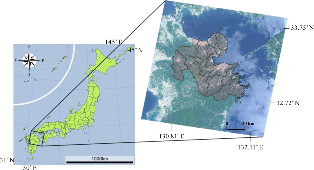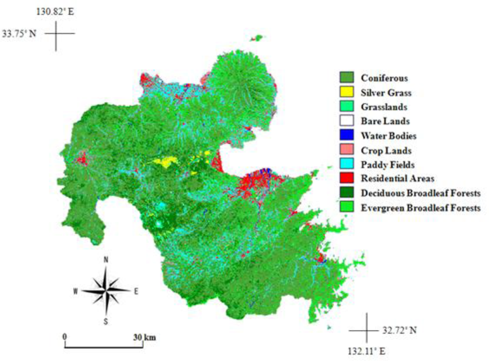 The research area, Oita Prefecture, is located on the Kyushu Island in the southwestern part of Japan (Figure 2), between 130.81°E and 132.11°E, 32.72°N and 33.75°N, with a total land area of 6,339 km2. Official figures show that 4,540 km2 (or 72%) of Oita Prefecture’s lands are covered by forests [].
