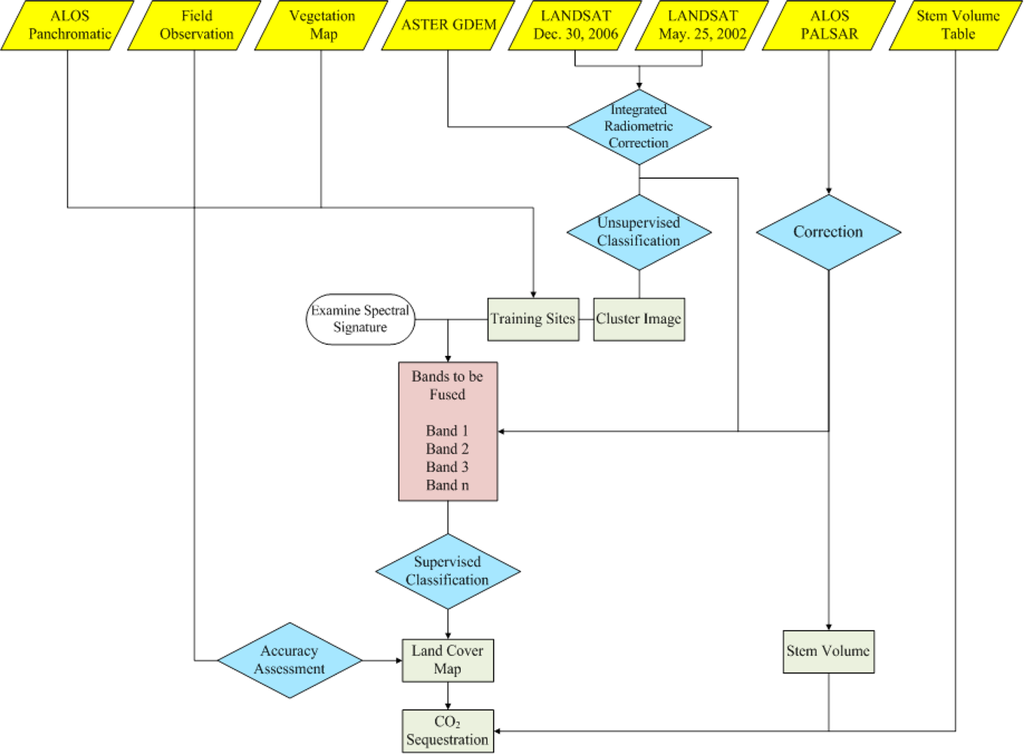 This research has employed multitemporal LANDSAT ETM+ and ALOS PALSAR data together with field data collected in Oita Prefecture, Japan, to estimate the CO2 sequestration potential of the forests in Oita. We have shown that sequestrations obtained by using averaged values for natural or planted forests without forest-type and tree-age discrimination can lead to large overestimations of the sink capacity of forests. It has been made clear here that, by combining the optical and SAR remote sensing data, it became possible to obtain more realistic CO2 sequestration amounts by the forests, based on detailed discrimination of forest type and tree age. Moreover, the detailed information about the spatial location and the status of the forest resources is more likely to provide the decision makers with a sound basis for more effective policies and actions aiming at the sustainable use and conservation of the environmental resources.