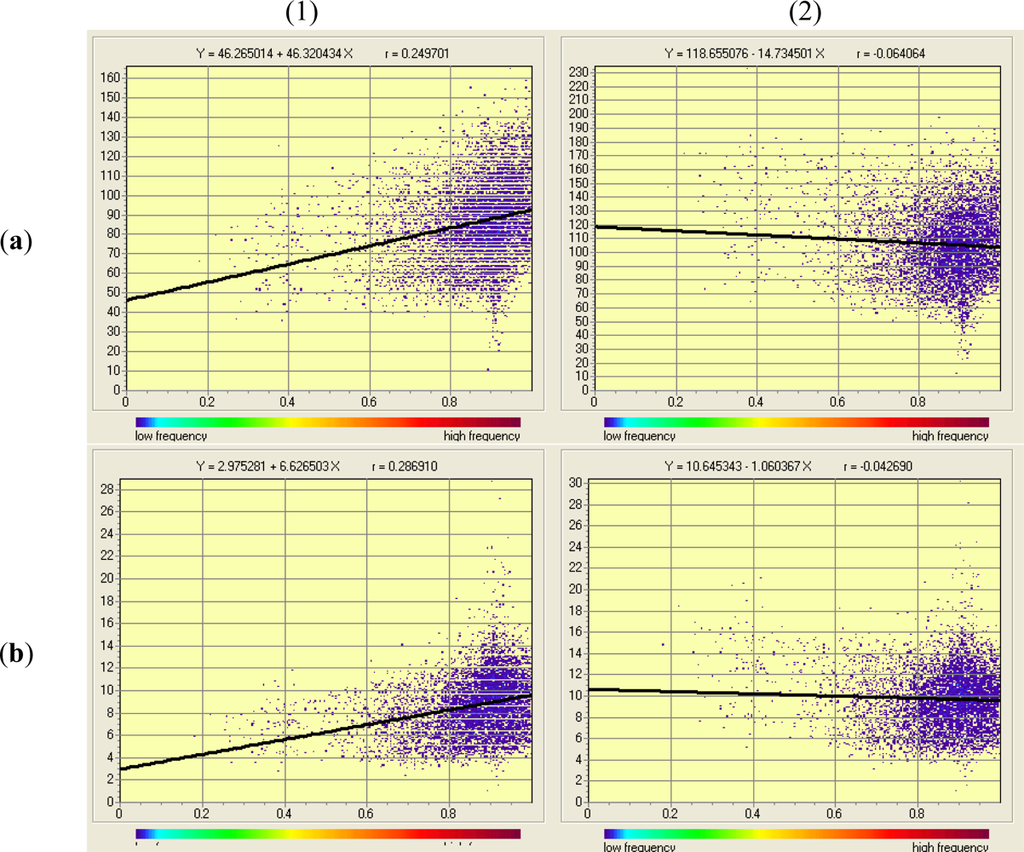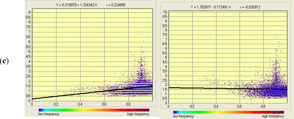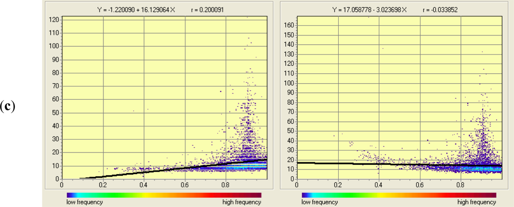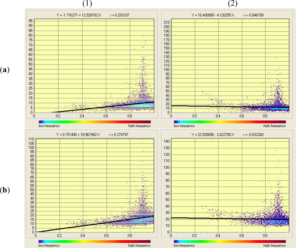 Regression analysis between cos i on x-axis, and the radiance values on y-axis, for (a) band 1, (b) band 2 and (c) band 3, for the noncorrected (1) and for the corrected radiance data (2), respectively.
