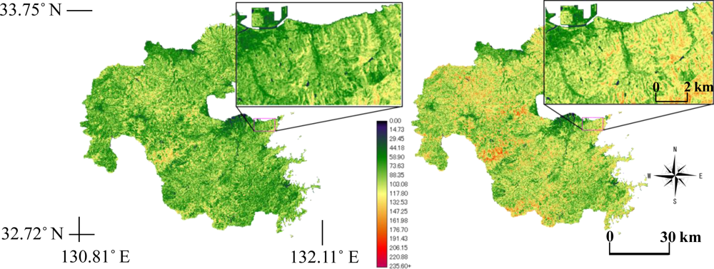 where, V is the stem volume (m3/ha) and σ is the backscattering intensity. Notwithstanding the fact that this expression was developed for forests in Indonesia, we decided to apply this model because Wijaya [] used it for very similar data to ours (PALSAR L-band FBD 34.3°HH/HV specifications). The stem volume map produced using this model was then classified into ages among the forests, referring to the relationship of the tree age and stem volume information provided by the Oita Prefectural Government. The classification was done for the coniferous and deciduous broadleaf forests, but not for the evergreen broadleaf forests for which no stem volume data were available. Sugi (cedar) tree data and Kunugi (saw tooth oak) tree data were used as representative for the coniferous forests and deciduous broadleaf forests, respectively.