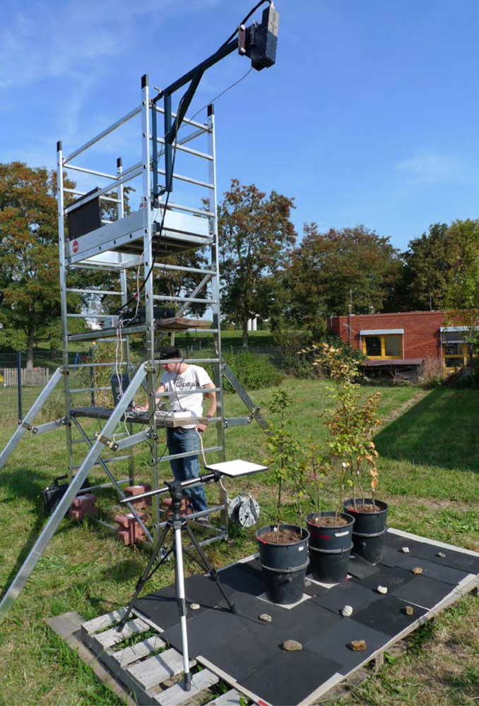 Setup for field imaging spectroscopy: Three pots with three beech seedlings each and a white reference are recorded.