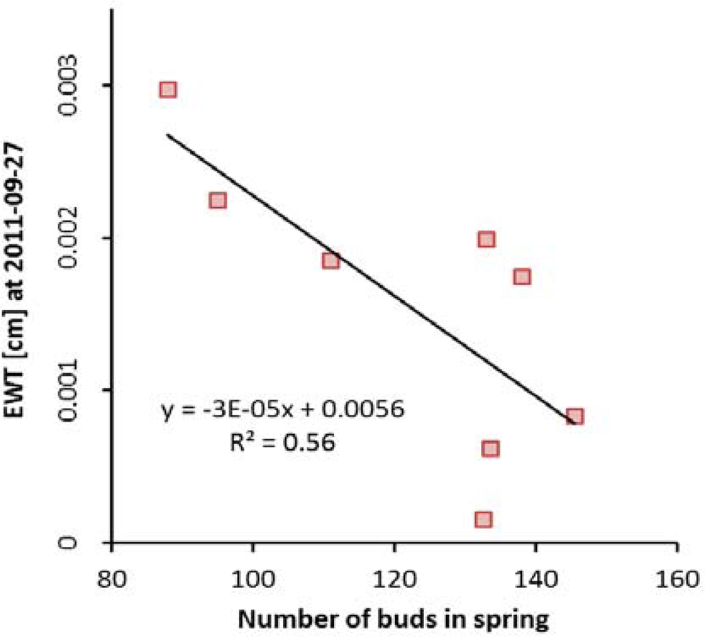 Figure 11 illustrates the relationship between buds counted in spring and EWT at the end of the experiment. This supports the assumption that trees with more leaves were more seriously affected by stress symptoms than trees with fewer leaves.