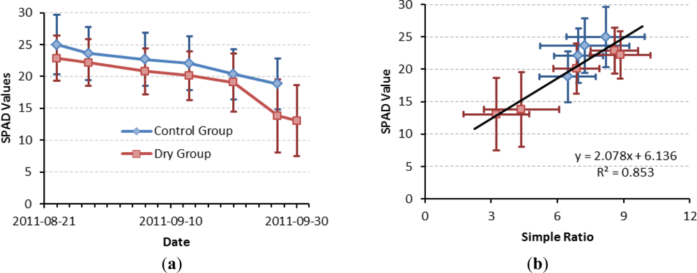 (a) Chlorophyll content of dry group and control group measured with Spad. Error bars indicate ±1 standard deviation of the leaves in each group. (b) A simple ratio estimation of chlorophyll content. Error bars indicate ±1 standard deviation of Spad and of simple ratio values per pot.
