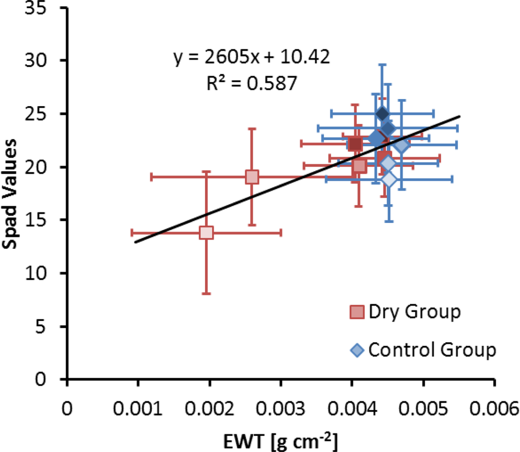 Correlation between Spad values and EWT for all measuring dates combined. Lighter symbols correspond to later measurement date. Error bars indicate ± 1 standard deviation.