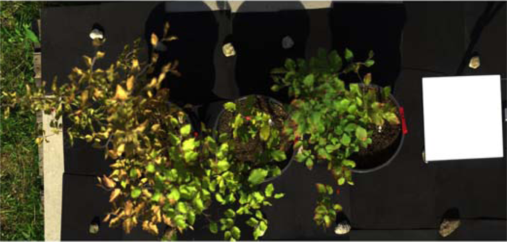 The aims of this study were: (1) testing the suitability of the experimental setup and the method of imaging spectroscopy in the VNIR for detecting dryness stress, (2) analyzing the effects of dryness stress under controlled conditions on the spectra, and (3) mapping and analyzing the spatial distribution of these effects in the young trees.