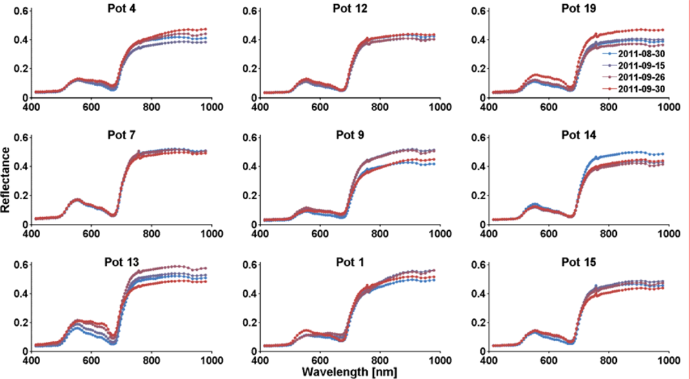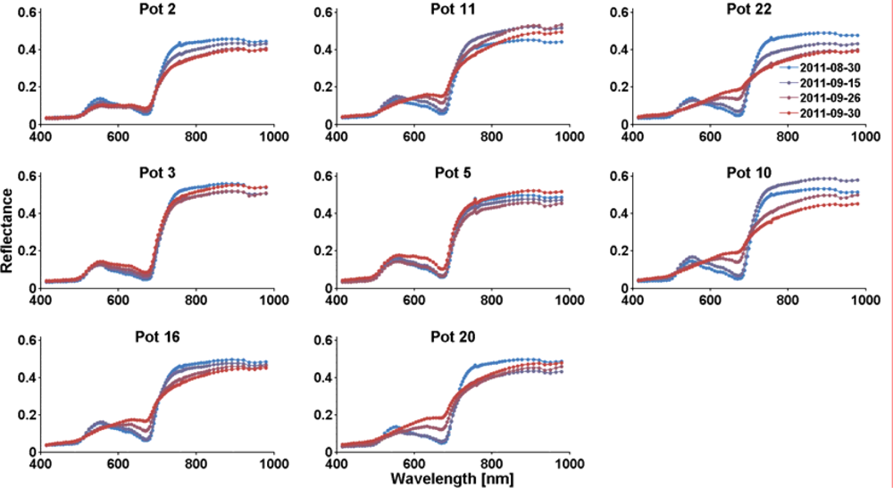Figure 2 shows a time series of images in true color (RGB = 608 nm, 557 nm, 451 nm). The three pots and the Spectralon white reference can easily be spotted. Each pot contains three trees, but these cannot be discriminated from above. For this reason, spectra have only been extracted for pots, not for single trees. Mean spectra for the respective pots were extracted from the images by manually identifying image regions dominated by leaves. For each region of interest and each time step, the mean spectrum was saved (Figures 3 and 4). These spectra (one spectrum per pot per recording date) were used as training spectra in the following regression analyses.