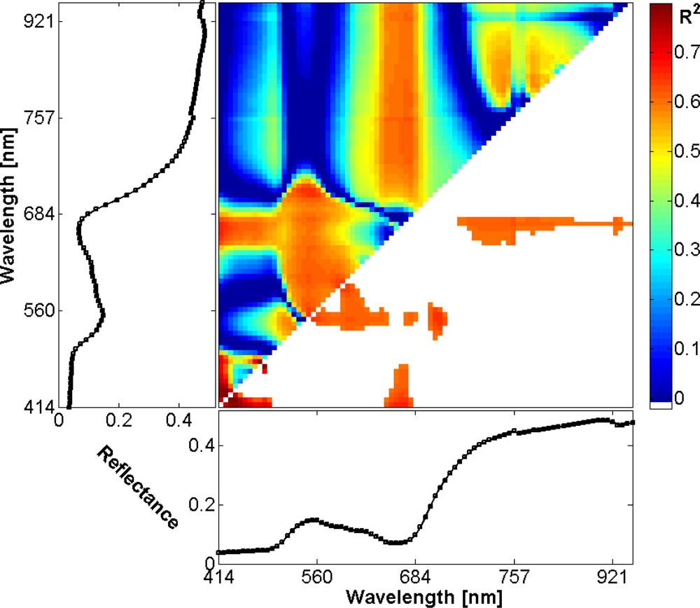 and determined correlation between the index values and measured EWT values. To mitigate overfitting, a leave-on-out cross-validation was applied. As can be seen in the 2D-correlogram in Figure 5 the indices were able to explain up to 0.79 of the EWT variance. The regions that correspond to the highest correlations are highlighted in red and orange in the correlogram []: The highest correlations exist between EWT and indices formed solely of bands in the blue spectral region around 450 nm. Further hotspots of correlation are located in the red and green regions (indices similar to PRI [,]) and in the region of indices, with one band in the red edge around 700 nm and the other band on the near infrared plateau. For other index types (ratio or difference indices), the results are similar.