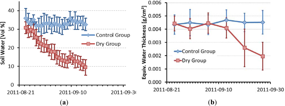 (a) Temporal development of soil water content in dry group and control group. The error bars indicate ±1 standard deviation between the pots of the groups. (b) Leaf water content of dry group and control group. Error bars indicate ±1 standard deviation of the leaves in each group.