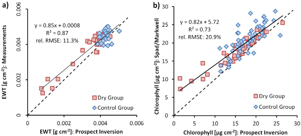 (a) EWT from Prospect inversion and measured EWT; (b) chlorophyll content from Prospect inversion and chlorophyll content measured with Spad, converted into μmol·m−2 by Markwell equation and into μg·cm−2 by multiplication with 0.09, both with 1:1 line (dashed) and regression.