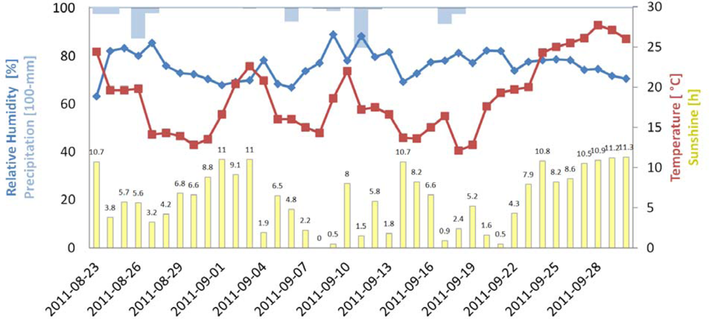 The weather conditions during the experiment are depicted in Figure 8. The trees were kept under a roof, but temperature and humidity were not controlled, so evapotranspiration and the drying rate were affected by the weather. Especially near the end of the experiment, weather conditions were warm and sunny, as reflected in the distinct dryness stress symptoms of the trees.