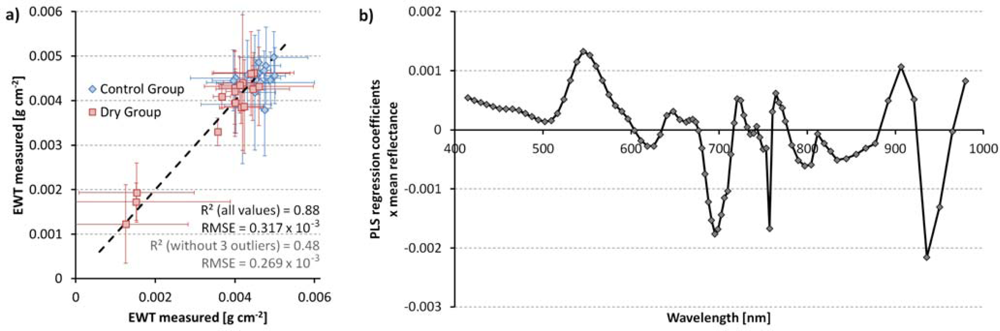 (a) PLS regression of equivalent water thickness derived from tree spectra with 1:1 line; horizontal and vertical error bars indicate standard deviation of measurements and PLSR-estimated water contents within the pots, respectively; (b) PLS regression coefficients multiplied by mean reflectance in the respective wavelength.