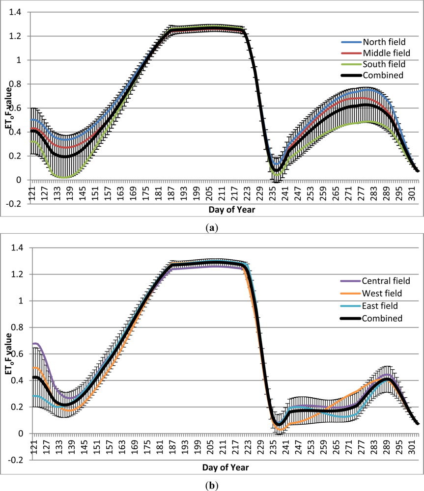 In each of the three field sites, a distinct pattern arose when plotting the EToF pixel values for the May through October growing season. In early May, the fields were wet, which gave the pixels a high starting EToF value due to the high soil evaporation. This was also the time when the pixel values are the most spread out. One standard deviation from the combined mean was 0.19. As May progressed, the fields dried, and EToF dipped in the south field down to zero, ±0.2. In the middle field, EToF dipped down to 0.3 ± 0.2 and in the north field down to 0.4 ± 0.2. Towards the end of May was when the crop coefficient curve becomes readily distinguishable, as the pixel values began to group together and rise through the crop development stage until early July, when the curve flattens as the crop reached midseason values. In all the fields, the midseason EToF values are between 1.2 and 1.3. Noteworthy was the increase from the established FAO-56 spring wheat midseason crop coefficient value of 1.15 [1]. This departure is partly due to the fact that values calculated for the FAO-56 document are from research that is at least 15 years old. In that time, wheat varieties have improved and farming practices have evolved to produce higher yielding (and higher transpiring) crops. Another possible reason for the higher midseason EToF values was that the ground-based weather data for calculating ETo in METRIC was provided by the BREBS, which does not represent a grass-based reference surface. This could slightly deflate the ETo values and, thereby, inflate the EToF values. The crops remained in midseason until the middle of August, when the EToF values plunged over the course of 10 days, as the crop senesced to values ranging from just below zero to 0.5, with most values between zero and 0.2. Immediately after this plunge, the EToF values began to rise again, as the cover crop began to grow. In the middle field, the EToF curve reached its peak near DOY 275 with values ranging from 0.4 to 0.9, with most values between 0.6 and 0.8. In the north field, the EToF curve generally exceeded that of the middle field and had values that peaked between 0.7 and 0.8 around DOY 280. The south field also peaked around DOY 280, but its values were noticeably lower than in the other two fields, with values ranging between 0.3 and 0.8, most of which are between 0.3 and 0.6. Figure 2(a) shows the mean from each of the three fields, as well as the combined mean for all the fields.