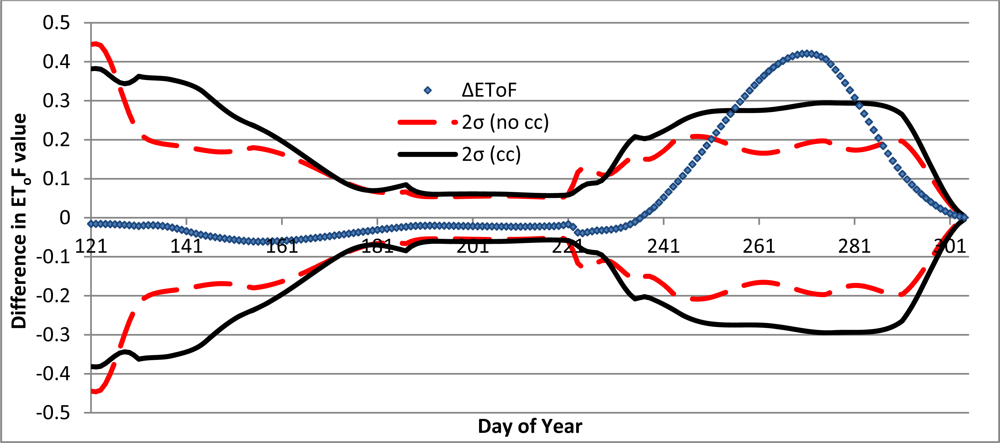 There were five image dates during the cover crop season: DOY 227, 235, 243, 275 and 291. The wheat was harvested on 5 August (DOY 217), and the cover crop was planted on 12 August (DOY 224). From Figure 2(a), however, the METRIC-derived values do not show that week of fallow until DOY 235, which is August 23. This was because on the 14 August (DOY 226), there was a large rain event that resulted in very high EToF values for the 15 August (DOY 227) image. Because of this, the graph in Figure 2(a) does a very quick turnaround after DOY 235, when in actuality, the EToF values had been largely below 0.2 since DOY 217. Another cause for this discrepancy was the fact that the last image date during the wheat season was DOY 187, when the wheat was in midseason form. There were no useable images during the wheat crop’s senescence, and therefore, no reference for METRIC to begin a downslope. The METRIC curves shown in Figure 2(a,b) were very similar throughout the wheat season and only really began to differ after the wheat was harvested. Figure 2(a) shows that the cover crop raised the EToF values to a peak of around 0.7 in early October (DOY 279) with one standard deviation reaching maximum values of 0.15 at around the same time. Figure 2(b), on the other hand, shows no such increase in EToF values until a small rise in mid-October (DOY 289) that reached a peak of around 0.4 with one standard deviation of around 0.1. The difference in EToF between fields with and without cover crops is shown in Figure 3. From Figure 3, note that the difference between the two combined means stayed well within two standard deviations of either combined mean until the cover crop season. Even with the relatively large standard deviation of the combined mean in Figure 2(a) from DOY 250 to DOY 290, the difference between the two curves was well outside of two standard deviations from the combined means. This indicated a distinct difference in estimated ETa rates for the period from the middle of September to the middle of October.