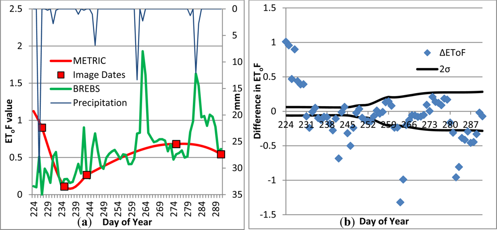 Though both the METRIC model and calculations from the BREBS attempt to close the energy balance equation, their methods of doing so are very different and should be viewed as such. That being said, Figure 4(a,b) shows the results from each graphed together and the difference between them. With the BREBS, precipitation events promptly result in spikes in the EToF values. With METRIC, there were only five image dates to provide data. Since the daily data points were interpolated between image dates, and daily precipitation amounts are not included in METRIC, the EToF graph is a relatively smooth curve. As Figure 4(a) shows, after a rain event, the BREBS curve spiked, but after a few days returned to approximately the value of the METRIC curve. DOY 217 (5 August) was the harvest date and represented essentially bare soil conditions. However, METRIC was unable to follow the ground-based data here because of the wet conditions of the DOY 227 image; such high rates of estimated ETa (even though it was all soil evaporation) indicated a healthy, growing field.