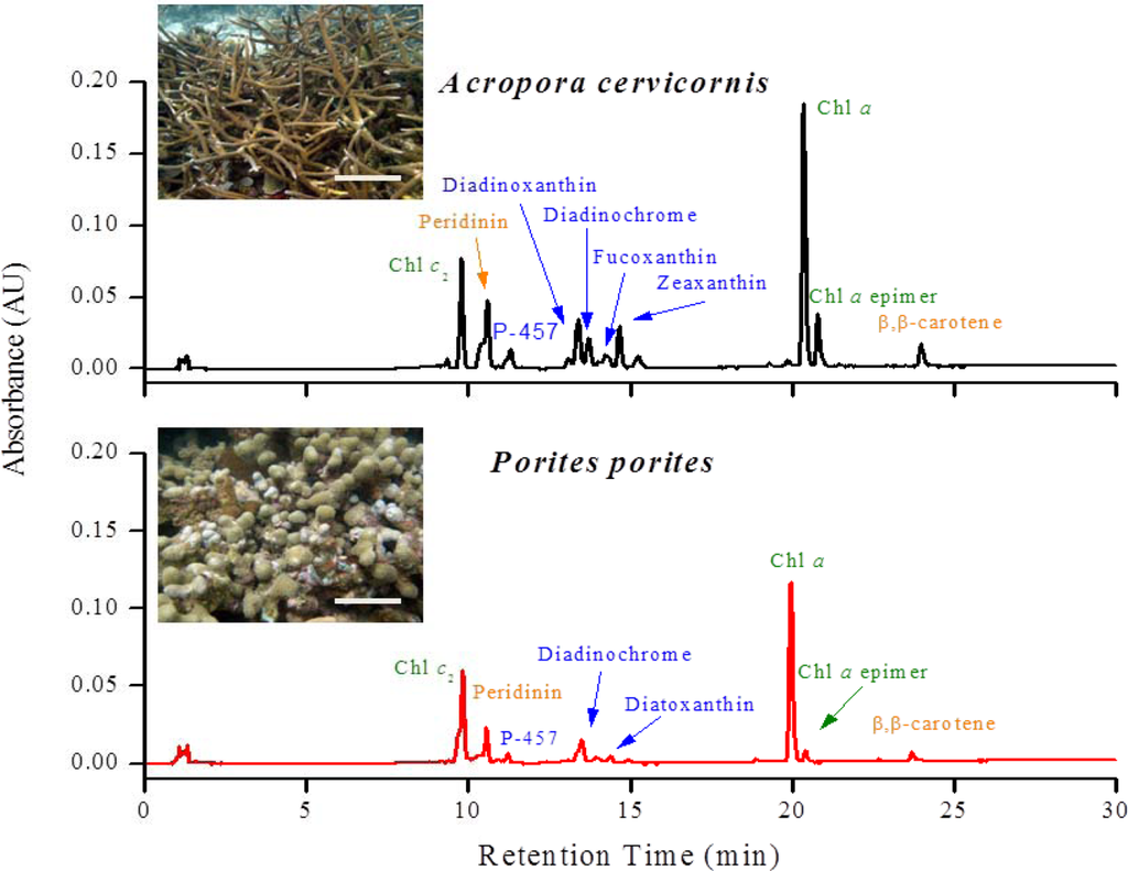 - Apprill, A.; Bidigare, R.R.; Gates, R.D. Visibly healthy corals exhibit variable pigment concentrations and symbiont phenotypes. Coral Reefs 2007, 26, 387–397. [Google Scholar]
