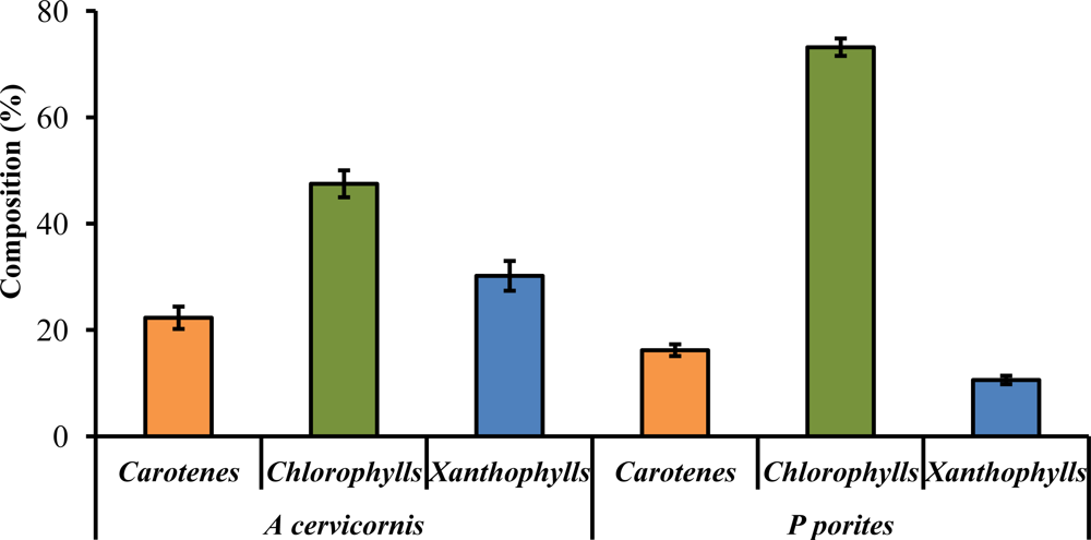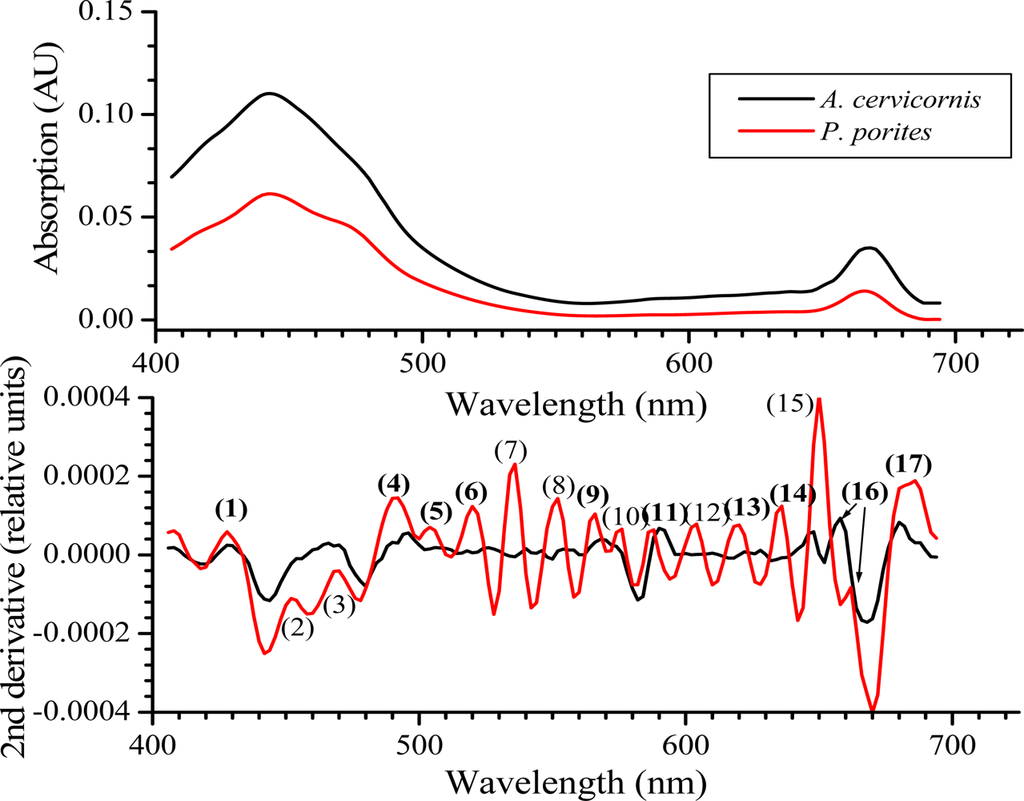 | Pigments/Compounds | Acropora cervicornis | Porites porites | Abs. Peaks* | ||||