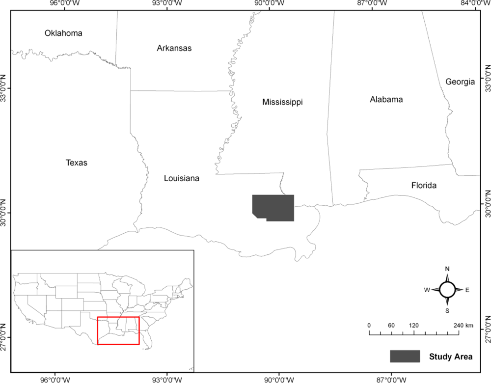 The study area included the city of New Orleans and the surrounding area of Lake Pontchartrain (Figure 2). New Orleans is located in the state of Louisiana, approximately 90 km north of the Gulf of Mexico and right below Lake Pontchartrain. The Mississippi River crosses the city before reaching Gulf of Mexico and the Atlantic Ocean. The area of the city and its suburbs is approximately 350 square miles and, according to census data of the National Historical Geographic Information System (NHGIS), approximately 1,000,000 people used to live in this area in 2000.