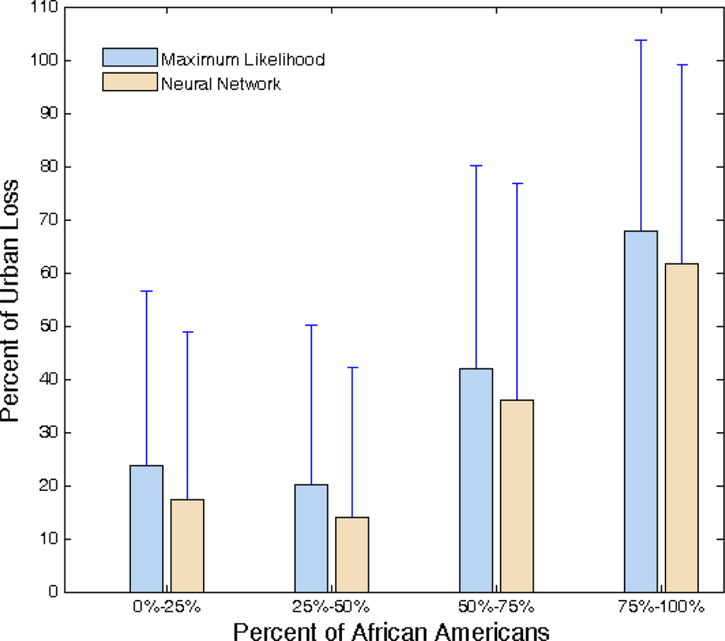 To investigate further, Figure 8 illustrates the relationship between urban loss and percent of African-American residents. In this chart, tracts are grouped into different bins based on 25% quartiles of African Americans. Bars represent mean value of urban loss for each bin. Moreover, standard deviation of tracts’ urban loss for each bin is depicted. The ML method estimates higher urban loss but the strong positive correlation between percent of African Americans and urban loss is evident for both classifiers. The similarities between both classifiers could probably be attributed to the significant geographic overlap between the reference sample area and the selected tracts.