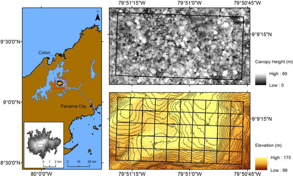 Geographic location of study area: (Left) Canal Zone with Barro Colorado Island (inset and red square). (Right) 50-ha Forest Dynamics Plot on Barro Colorado Island with (Upper) maximum canopy height (m) from lidar digital canopy surface model and (Lower) elevation (m) from lidar digital elevation model with 1.0-ha grid.