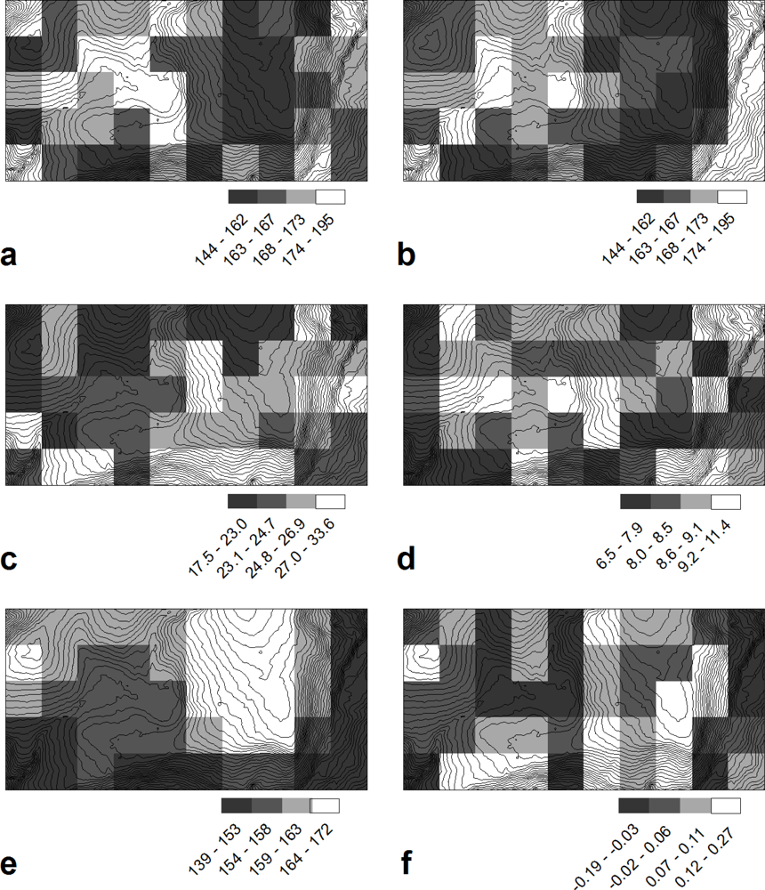 Maps of (a) observed species richness, (b) predicted species richness from 1.0-ha minimum Akaike’s Information Criterion (AIC) model, (c) mean canopy height (m); (d) standard deviation of maximum canopy height (m); (e) mean elevation (m); and (f) mean curvature (m−1). Figures are shaded by quartiles, except predicted species richness, which is shaded by quartiles of the observed species richness distribution.