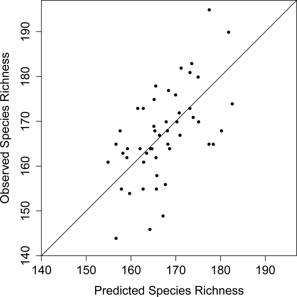 The minimum AIC model (AIC = 353.2) described 47.9% of the total variation in species richness at 1.0-ha scale (R2 = 0.479). Using Moran’s I, we did not detect spatial autocorrelation in the residuals (Observed I = −0.005; Expected I = −0.020; SD = 0.0191; p = 0.42). The predictive accuracy of the model evaluated using leave-one-out cross-validation (Figure 3) yielded a mean error of 6.5 species and a RMSE of 8.3 species. The increase in cross-validated predictive accuracy was 19.0% relative to an intercept only model when measured in units of species.