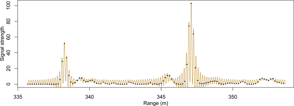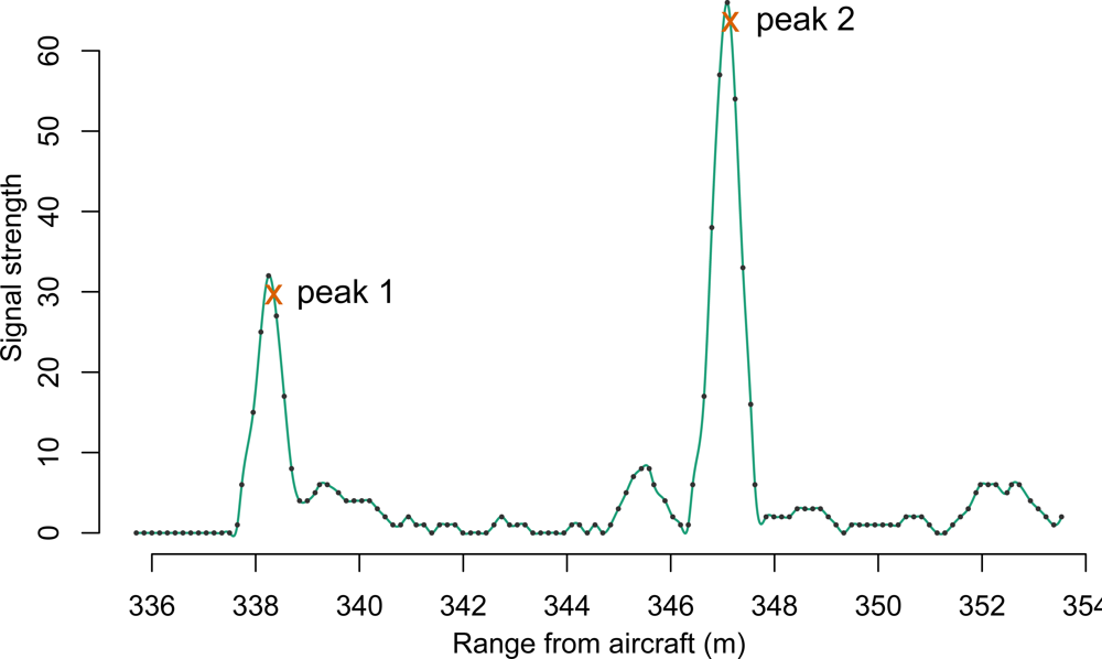 An example waveform and probable associated discrete return points. The 120 waveform samples are shown as circles and a spline fit to these data appears as a solid line. A peak detector might detect two peaks at about 338 and 347 meters and return the intensity value when the peak is detected as shown with exes. Without knowledge of future sample values, real time peak detection algorithms usually produce a slight lag in peak location.