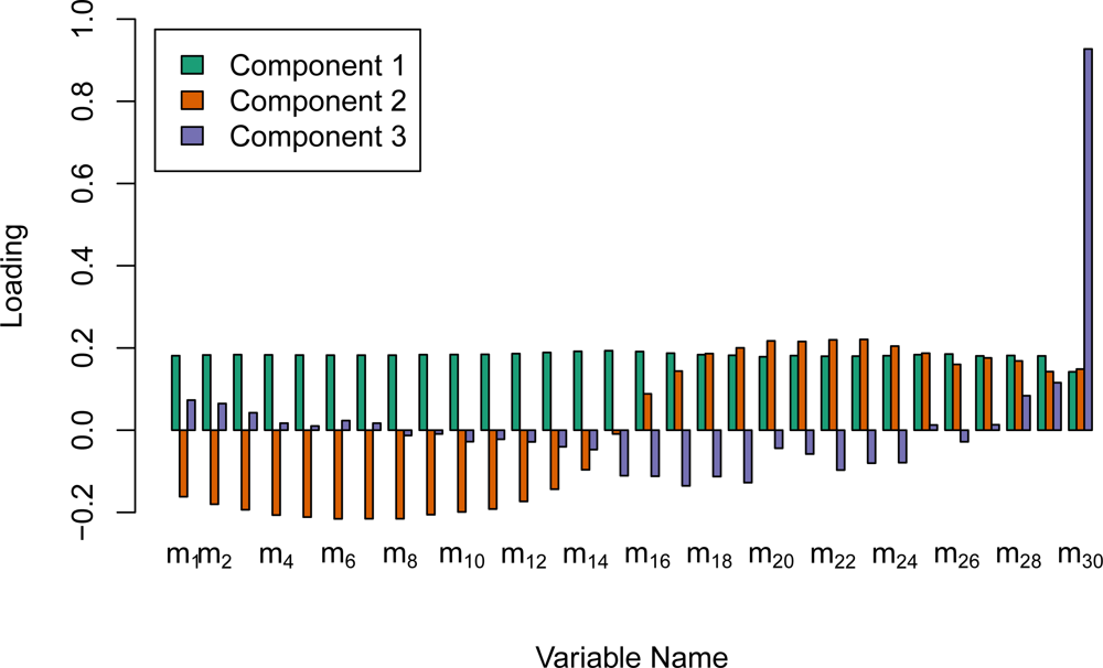 Loadings of the first three principal components of the Fourier median variables (m1 to m30).