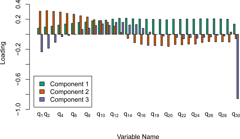 For the IQRs, the standard deviations were 4.54, 2.72, 0.82, 0.67, and 0.40 respectively. Figure 7 shows the loadings for the first three components for the IQR variables (q1 to q30). A similar pattern to what appears in Figure 6 is displayed here as well. The first factor measures the mean amplitude, and the second and third factor compare the frequencies in similar groups.