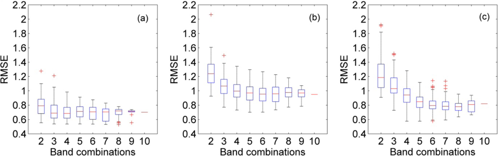 | Arrangement (No. of Included Spectral Bands) | N (No. of Band Combinations) | RMSEmin | ||