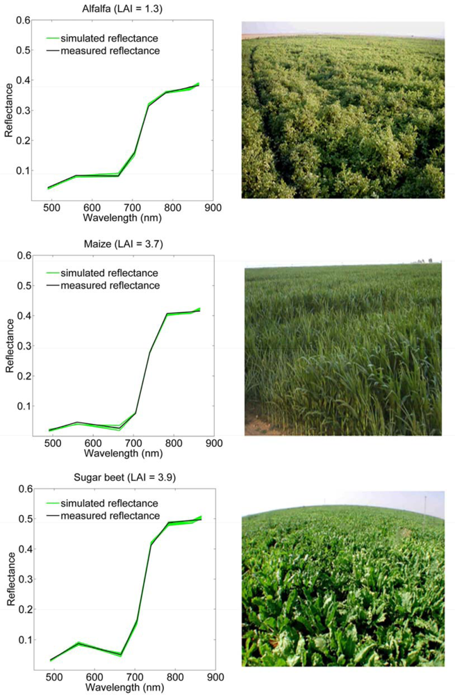 - Koetz, B.; Baret, F.; Poilve, H.; Hill, J. Use of coupled canopy structure dynamic and radiative transfer models to estimate biophysical canopy characteristics. Remote Sens. Environ 2005, 95, 115–124. [Google Scholar]