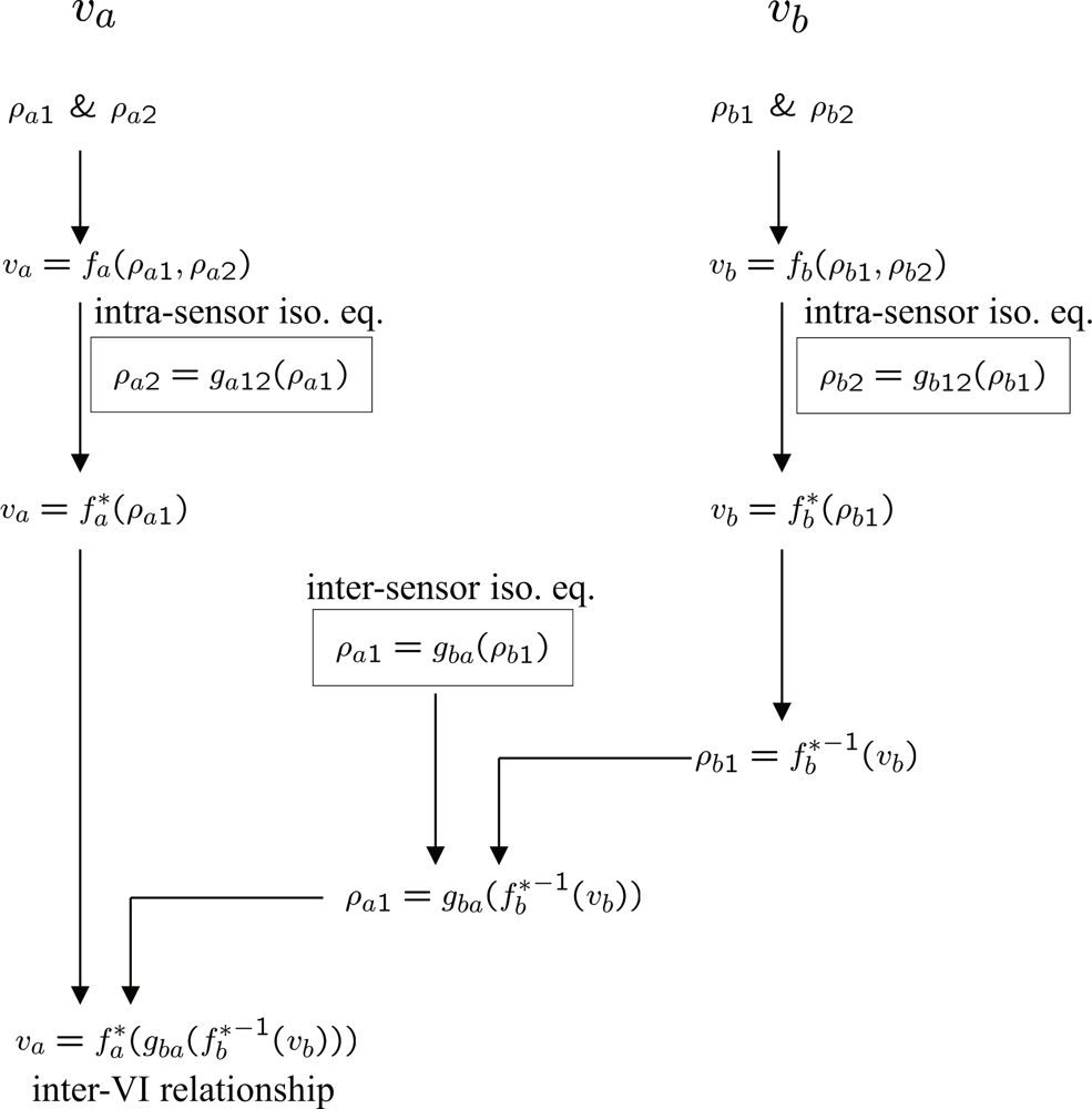The last step is to relate ρa1 and ρb1 used in va and vb, respectively, by the third isoline equation. Note that this reflectance relationship is the inter-sensor relationship that connects outputs from two sensors.