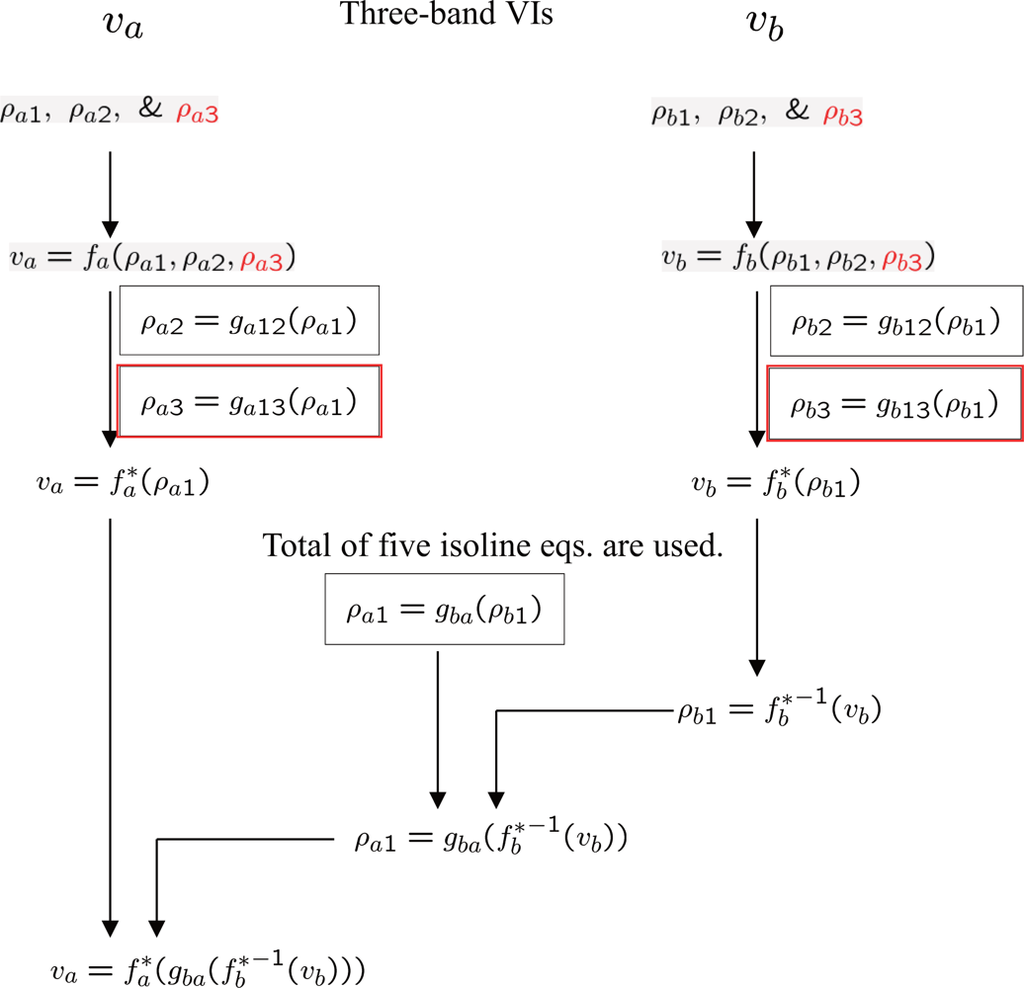 Illustration of the derivation steps for the case of three-band VI. The differences from the case of two-band VI are denoted by red.