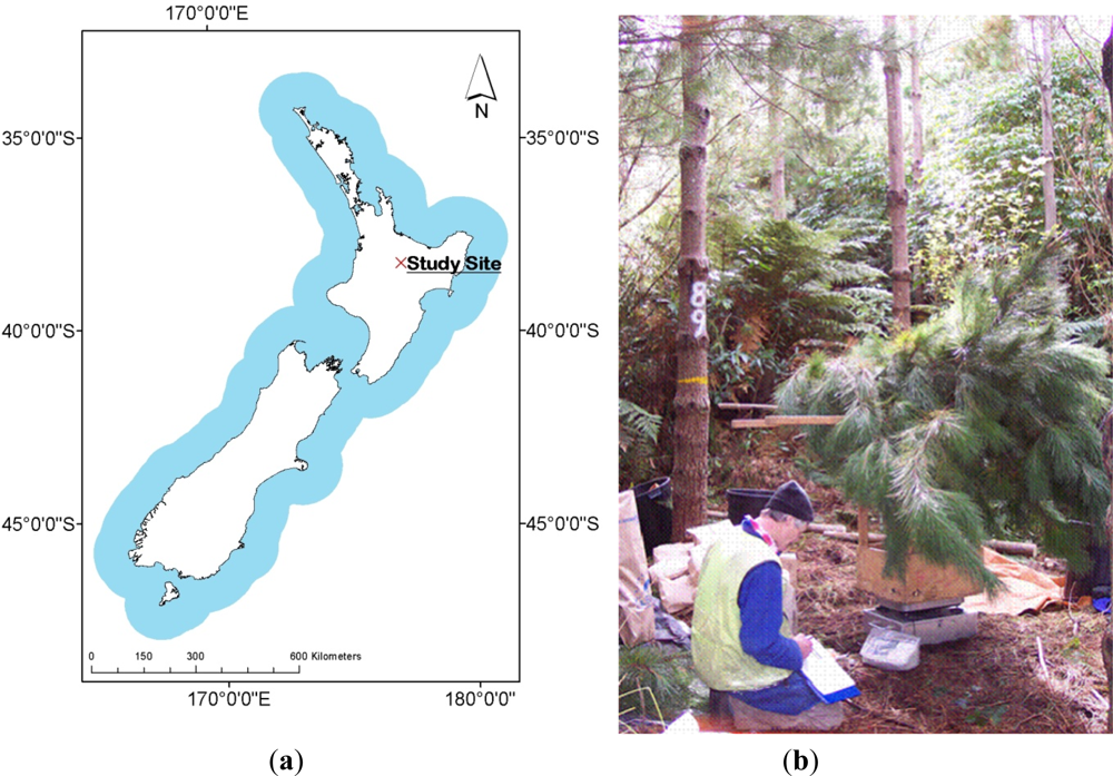 (a) Study location in North Island, New Zealand, and (b) foliage measurement.