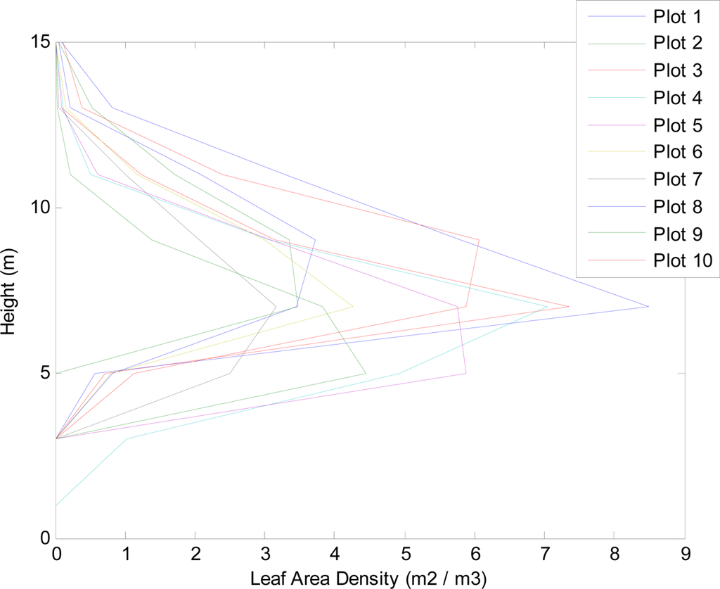 We cannot compare individual pulse metrics with LAD values as LAD was defined over a larger volume, but we can compare average LAD over a volume with average parameter values. Figure 10 shows how LAD varied by height for the ten plots. Understorey was not included in the LAD measurements, although its height was noted and did not exceed 4 m.
