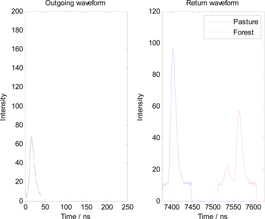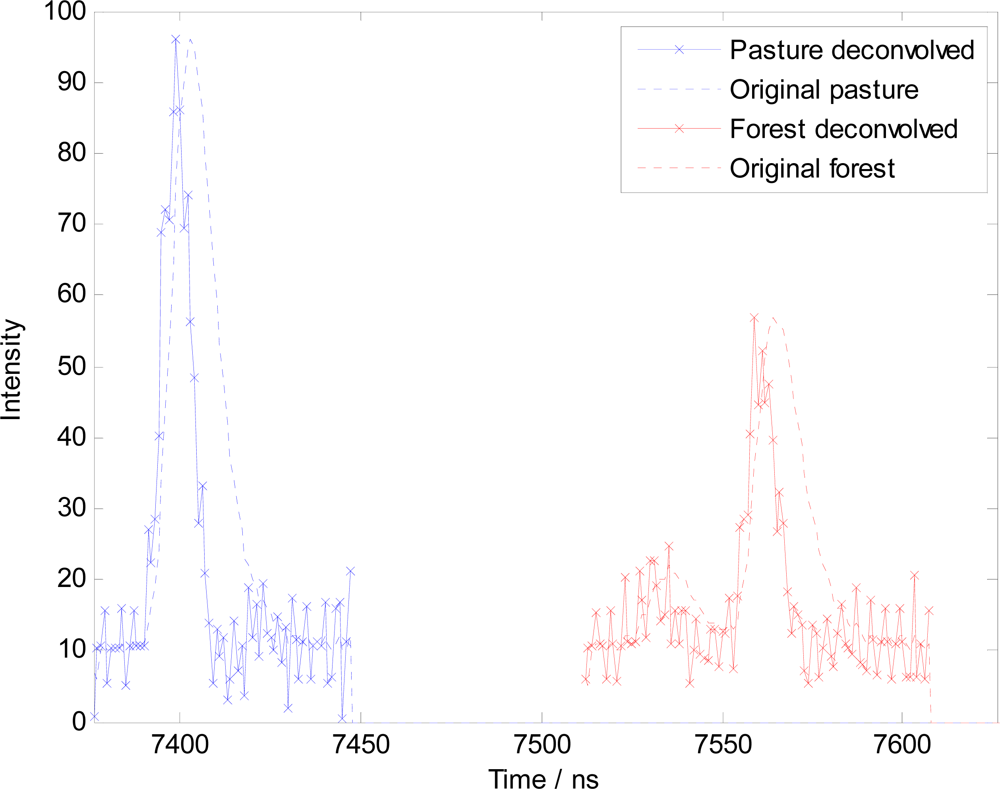 These two observations are common, but do not unambiguously distinguish a return from forest cover from a return from pasture. Many forest waveform traces may yield only one peak, and in many cases the peak amplitude of the forest return may be greater than that from pasture. There is a general similarity between the peaks in both traces that is driven by the shape of the outgoing pulse. If we remove the dominance of the outgoing pulse from the return signal then more information can be learned about the target. Also of note in the figure is the almost exact similarity of the outgoing waveforms, and the similarly in width of the outgoing pulse and the return from pasture. It is odd that the return waveform in this case has a stronger intensity than the outgoing pulse (which if genuine would imply that extra energy were somehow added into the system), but this is in fact due to the way in which the outgoing pulse is sampled and the reflected and outgoing intensity units should not be considered equal.