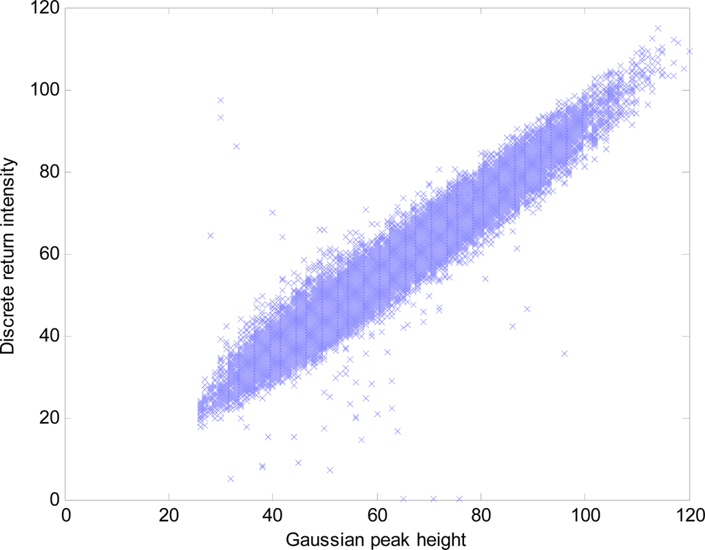 Figure 5 shows the Gaussian peak height vs. discrete return intensity for all plots. Although there is a small amount of variation, it is apparent that the discrete return intensity recorded by this unit is based on peak amplitude. The small amount of variation is due to Gaussian fitting being based on the deconvolved waveform, whereas the discrete return intensity is based on convolved data.