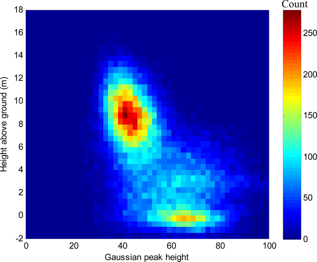 Bivariate frequency distribution of peak height of Gaussian curves fitted to deconvolved waveform LiDAR vs. height above ground.