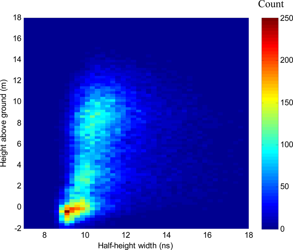 Bivariate frequency distribution of half-height width of Gaussian curves fitted to deconvolved waveform LiDAR vs. height above ground.