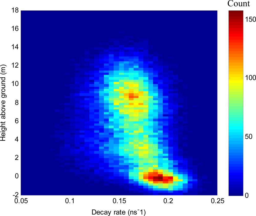 Bivariate frequency distribution of decay rate of exponential curves fitted to deconvolved waveform LiDAR vs. height above ground.