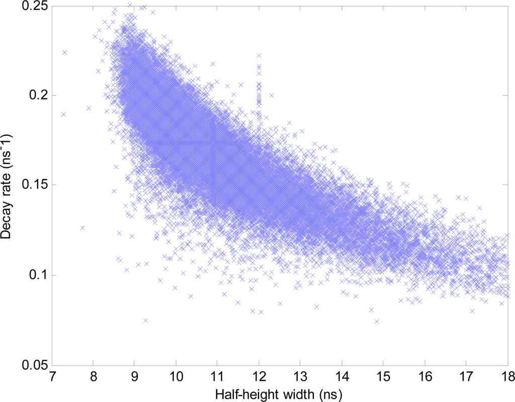 Scatter plot of half-height width vs. decay rate for curve fits on deconvolved waveform LiDAR.