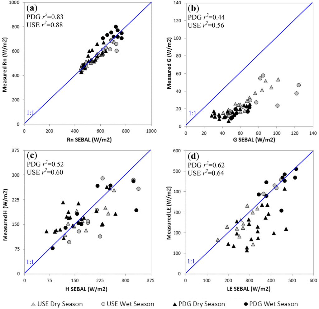 Estimation of daily ET requires the integration of instantaneous fluxes Rn, G and LE predicted by SEBAL using EF and Rn,24h. As a starting point, the accuracy of estimated EF was assessed relative to the measured data. Next, the validation of the EF as a constant indicator of energy partitioning throughout the day (taken as the period between 7:00 h and 18:00 h) was examined. When the estimated instantaneous EF was compared with observed values, an overestimation by 12% and 18% was found at USE and PDG sites, respectively, most probably as a consequence of underestimation of turbulent fluxes measured by the EC system and in SEBAL’s energy balance closure, causing significant reduction in EF (Figure 3(b)). Figure 5 shows estimates of instantaneous energy fluxes found using SEBAL and the daily energy cycle observed at EC monitoring sites for two days during wet and dry seasons, together with diurnal variability in EF at those sites.
